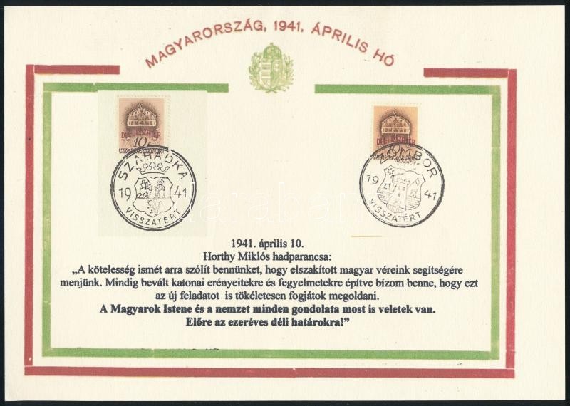Beschreibung: 1941 Horthy Miklós hadparancsa a Délvidék visszatérte alkalmából kiadott emléklapon 21x15 cm