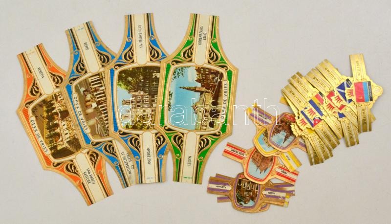 Beschreibung: 24 db szivargyűrű: közte 4 db nagyméretű és 10 db kisméretű Derk De Vries városképes szivargyűrű, és 10 db zászlómotivumos Willem II szivargyűrű
