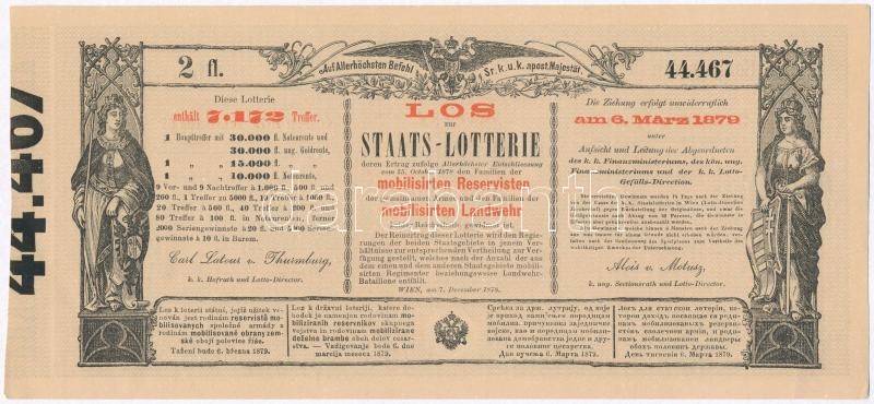 Ausztria / Bécs 1878. "Sorsjegy állam-sorsjátékra a közös hadsereg mozgósított tartalékosai s az osztrák és magyar állam mozgósított honvédei családjai javára" T:I Austria / Vienna 1878. "State Lottery Ticket for the Reservist of the Joint Army and the Families of the mobilized Honved's" C:UNC