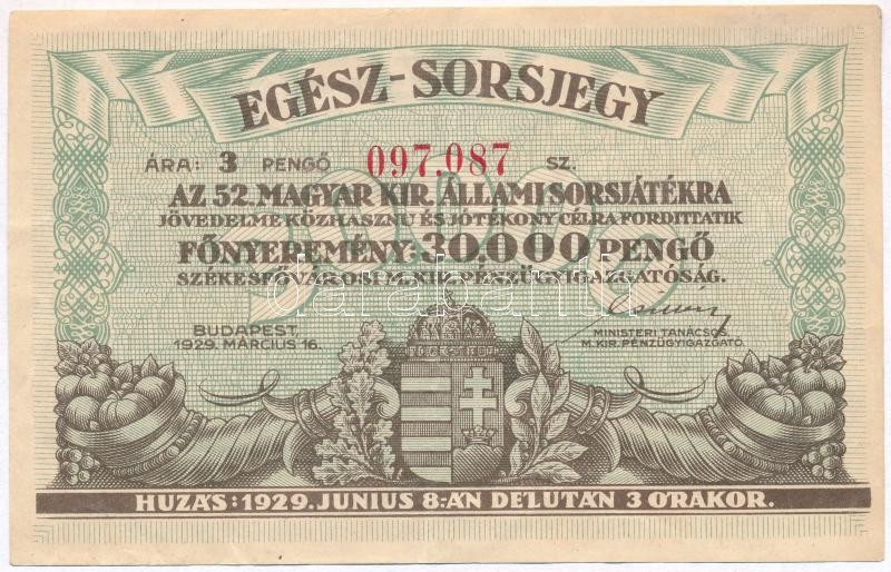 Beschreibung: Budapest 1929. "52. Magyar Kir. Államsorsjáték" egész sorsjegye 3P értékben T:III