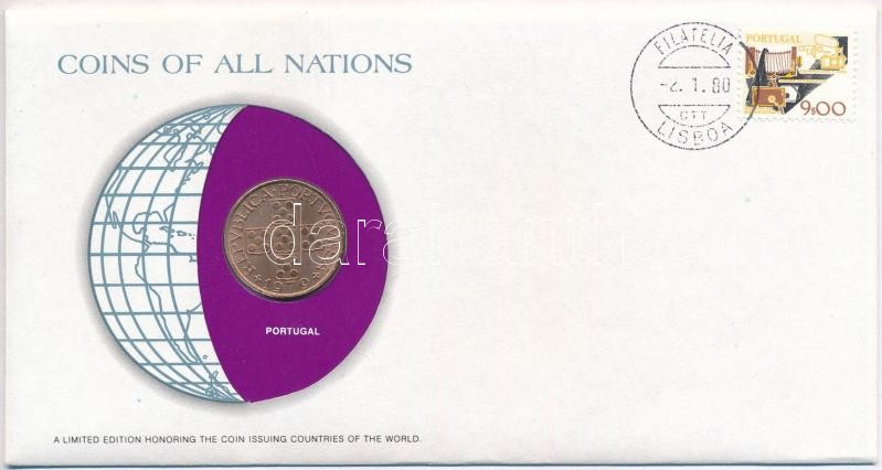 Portugália 1979. 1E "Nemzetek pénzérméi" felbélyegzett borítékban, bélyegzéssel, holland nyelvű leírással T:1- Portugal 1979. 1 Escudo "Coins of all Nations" in envelope with stamp and stamping, with Dutch description C:AU