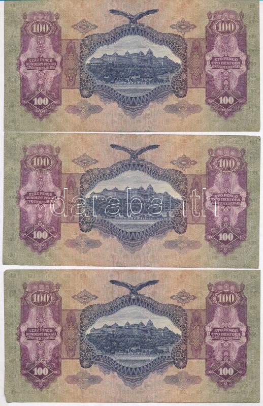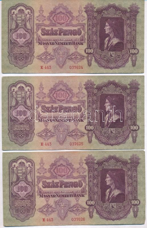 Beschreibung: 1930. 100P (3x) sorszámkövetők néhány darabon nyomdai papírránc T:I,I- egyiken bankjegy jobb alsó sarkán szamárfül