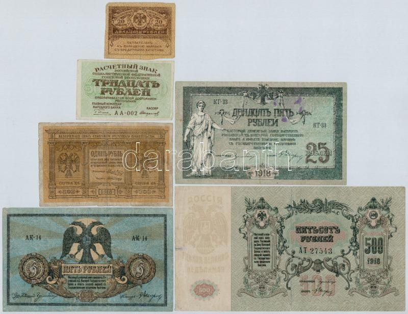 Orosz Birodalom 1917. 20R + Orosz Polgárháború / Dél-Oroszország / Gyenyikin és Wrangel hadserege 1918. 5R + 25R + 500R + Szibéria és Urál / Ideiglenes Szibériai Igazgatás 1918. 1R + Szocialista Szövetségi Szovjet Köztársaság 1919. 30R T:III,III-