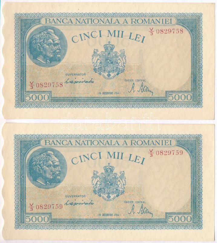 Romania 1944. 5000 Lei (4x) 2+2 sequential serials, with "V/3 0829758 - V/3 0829759" és "D/3 06296844 - D/3 0629845" serials C:AU,XF