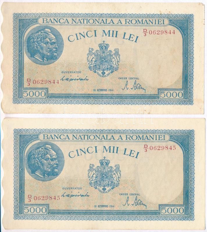 Románia 1944. 5000L (4x) 2+2 sorszámkövetők, "V/3 0829758 - V/3 0... https://www.darabanth.com/de/337-Fernauktion/337.0/Numismatik/Weltweit-Banknoten~1500013/Romania-1944-5000L-4x-2plus2-sorszamkovetok-V3-0829758-V3-0829759-es-D3-06296844-D3~II1895381