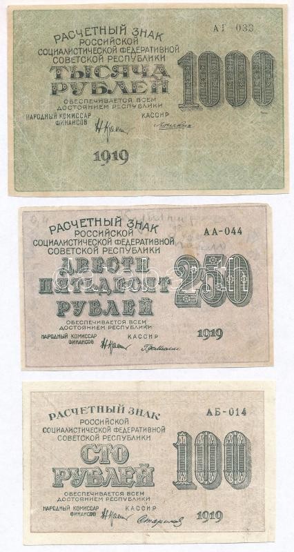 Szocialista Szövetségi Szovjet Köztársaság 1919. 100R + 250R + 1000R T... https://www.darabanth.com/de/337-Fernauktion/337.0/Numismatik/Weltweit-Banknoten~1500013/Szocialista-Szovetsegi-Szovjet-Koztarsasag-1919-100R-plus-250R-plus-1000R-TIII-III--Russian-Social~II1891318