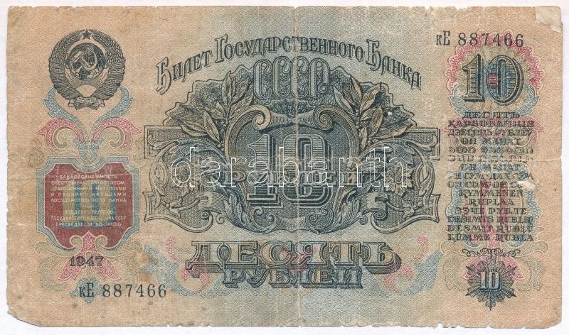 Soviet Union 1947. 10 Rubles C:VG,G https://www.darabanth.com/de/337-Fernauktion/337.0/Numismatik/Weltweit-Banknoten~1500013/Szovjetunio-1947-10R-TIII-IV-Soviet-Union-1947-10-Rubles-CVG-G~II1891304