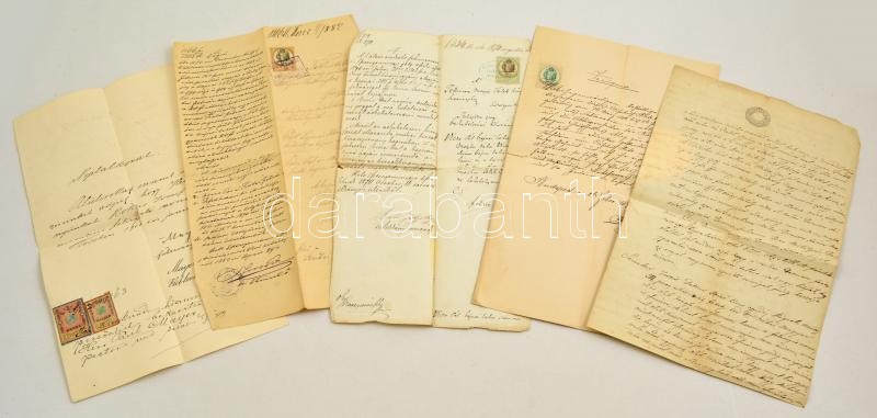 1870-1901 Régi okmánybélyeges papírok, 3 db 15 kr okmánybélyeges irat, 1 db 6 kr. szignettás irat, valamint egy irat 2 db osztrák okmánybélyeggel (1 k.,50 h.) Változó állapotban.