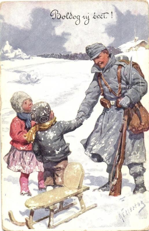 Beschreibung: Boldog Újévet! / WWI K.u.K. New Year greeting card with soldier and children in the snow, sled, B.K.W.I. 3162-2. s: K. Feiertag (fa)