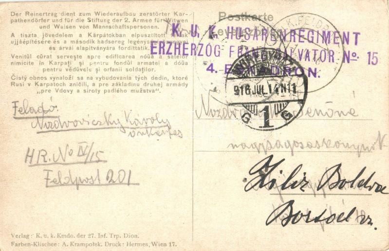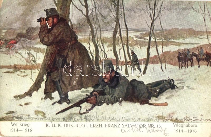 K.u.K. Husaren Regiment Erzherzog Franz Salvator Nr. 15., Világháború 1914-1916 / WWI Austro-Hungarian military, art postcard s: Hans Larwin + K.u.K. Husaren Regiment Erzherzog Franz Salvator Nr. 15. 4. Eskadron (kopott sarkak / worn corners)