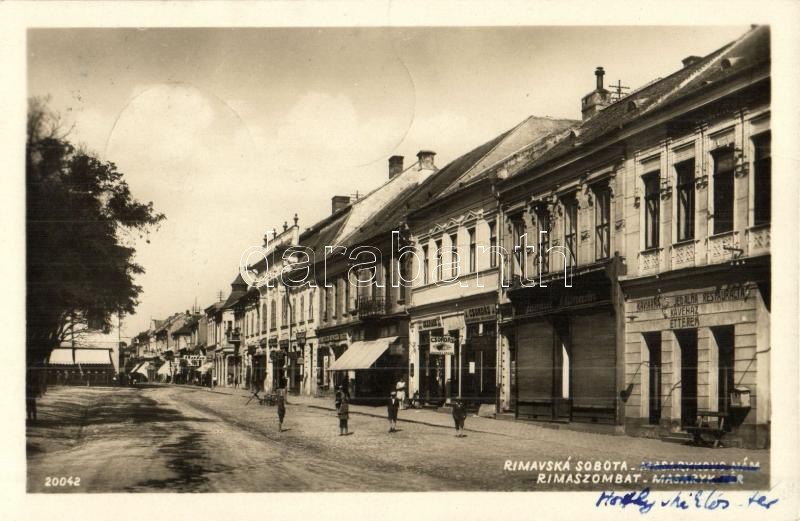 Rimaszombat, Rimavska Sobota; Masaryk (Horthy Miklós) tér, Kávéház és étterem, Sámuel Altmann, Csordás J., Dickmann és Róth Géza üzlete, Bata cipőbolt / square, shops, cafe, restaurant "vissza" So. Stpl