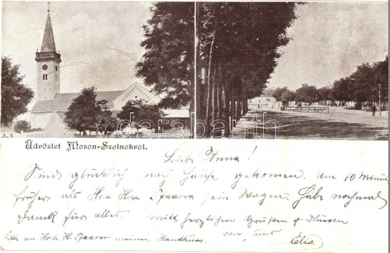 1901 Mosonszolnok, Római katolikus templom, Fő utca (fl) https://www.darabanth.com/de/338-Fernauktion/338.0/Ansichtskarten/Ungarn~2000005/1901-Mosonszolnok-Romai-katolikus-templom-Fo-utca-fl~II1899208