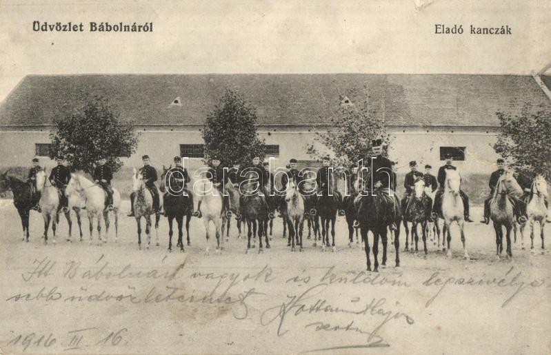 Beschreibung: 1916 Bábolna, Eladó kancák, méntelep. Kiadja Fischer Gyula (fa)