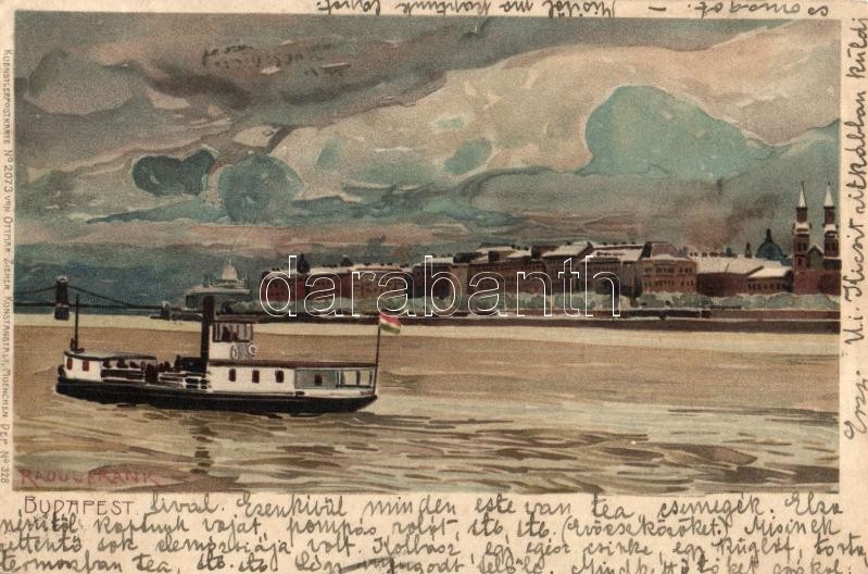 Beschreibung: Budapest, Lánchíd, gőzhajó. Ottmar Zieher Kuenstlerpostkarte No. 2073. litho s: Raoul Frank (r)