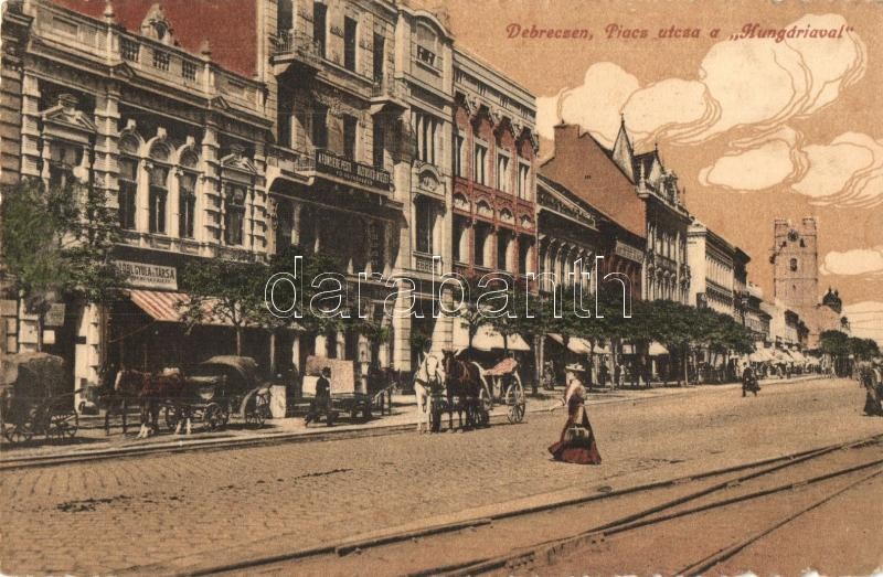 Beschreibung: Debrecen, Piac utca, Hungária, Löbl Gyula és Társa üzlete, Fonciere pesti biztosító intézet főügynöksége,