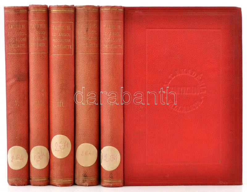 Taine Hippolit Adolf: Az angol irodalom története I-V. kötet. Fordította Csiky Gergely. Bp., 1881-1885, MTA. Kiadói egészvászon-kötésben, Hirháger-kötés, márványozott lapélekkel, a III. kötet borítóján kis sérülésekkel, részben kissé kopottas gerincekkel, volt könyvtári példány, de belül jó állapotban.