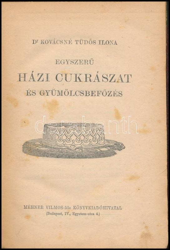 Dr. Kovácsné Tüdős Ilona: Egyszerű házi cukrászat és gyümölcsfűzés. Bp.,[1925],Méhner Vilmos, 104 p. Átkötött félvászon-kötés, néhány kissé foltos lappal.