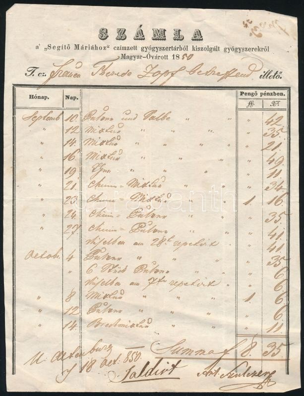 Beschreibung: 1850 Magyaróvár, a Segítő Máriához gyógyszertár számlája kiadott gyógyszerekről (szeptember-október)