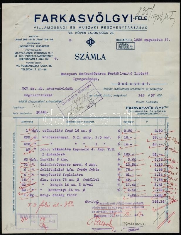 1928 Bp., Farkasvölgyi-féle Villamossági és Műszaki részvénytársaság f... https://www.darabanth.com/de/338-Fernauktion/338.0/Kunst-Dokumente-andere-Sammelgebiete/Dokument~500017/1928-Bp-Farkasvolgyi-fele-Villamossagi-es-Muszaki-reszvenytarsasag-fejleces-szamlaja-o~II1899601