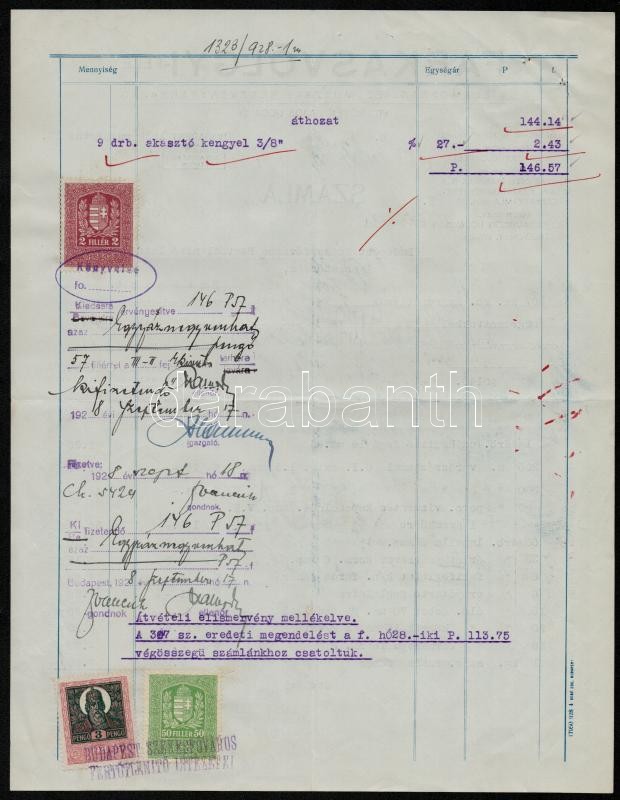 Beschreibung: 1928 Bp., Farkasvölgyi-féle Villamossági és Műszaki részvénytársaság fejléces számlája okmánybélyegekkel