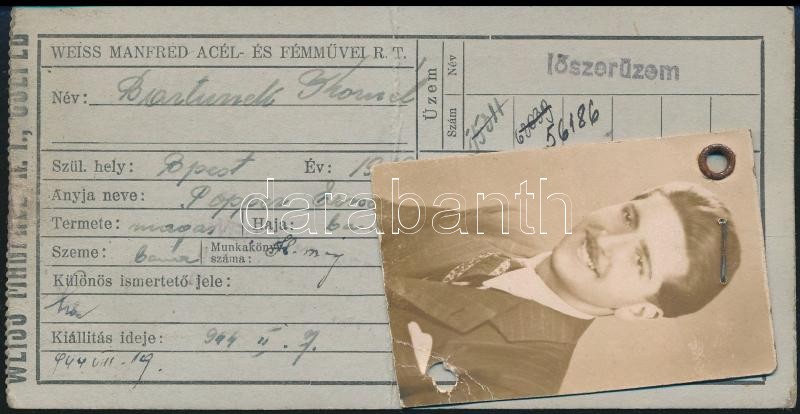 1944 Fényképes kapujegy a Weiss Manfréd Acél- és Fémművei Rt. lőszerüz... https://www.darabanth.com/de/338-Fernauktion/338.0/Kunst-Dokumente-andere-Sammelgebiete/Dokument~500017/1944-Fenykepes-kapujegy-a-Weiss-Manfred-Acel-es-Femmuvei-Rt-loszeruzemebe~II1901407