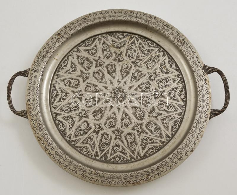 Gazdagon díszített fém füles tálca, d: 34,5 cm https://www.darabanth.com/de/338-Fernauktion/338.0/Kunst-Dokumente-andere-Sammelgebiete/Flohmarkt~500011/Gazdagon-diszitett-fem-fules-talca-d-34-5-cm~II1896156