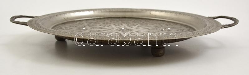Beschreibung: Gazdagon díszített fém füles tálca, d: 34,5 cm