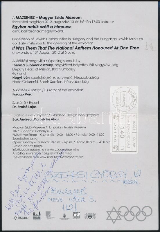 Beschreibung: Szepesi György (1922- ) sportriporter saját kezu dedikálás a Egykor nekik szólt a Himnusz c. kiállítás neki címzett meghívóján
