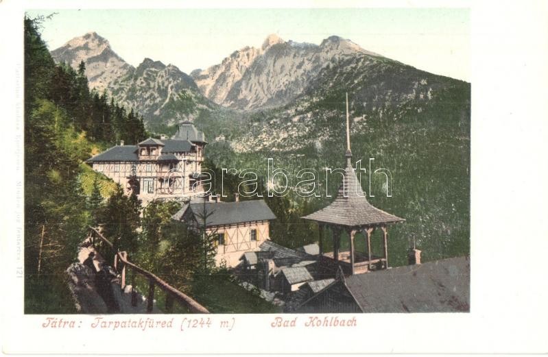 Tátra, Magas Tátra, Vysoké Tatry; Tarpatakfüred szálloda, Lomnici csúcs. Kiadja Cattarino 121. / Hotel Kohlbach, Lomnitzerspitze / Lomnicky stít / hotel and mountain peak