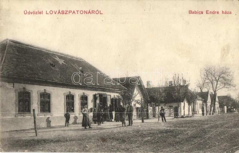 Beschreibung: Lovászpatona, Babics Endre háza (kanonok, pápai esperes), a házban vegyes üzlet. Babics Endre saját kiadása (EK)
