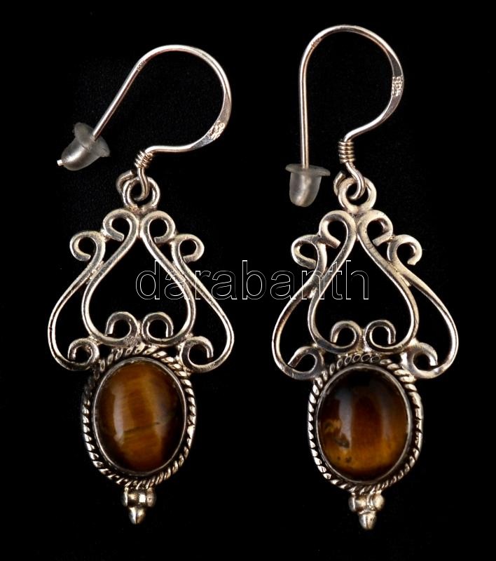 Beschreibung: Ezüst (Ag.) fülbevaló pár csiszolt tigrisszem berakással, jelzett, bruttó: 7,7 g