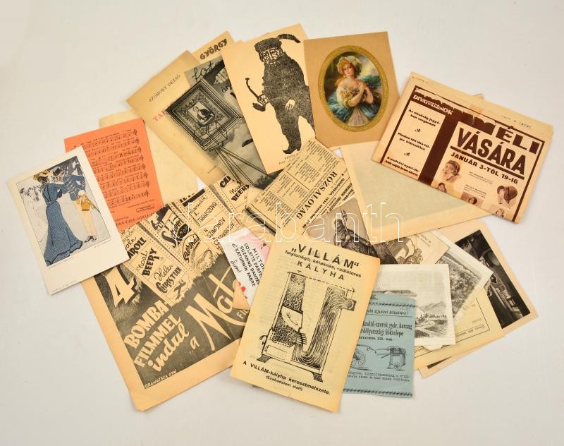 cca 1920-1940 Vegyes papírrégiség tétel, közte a 1937-es könyvnap nyomtatványával, Magyar Film nyomtatványával, különféle reklámanyagokkal, illusztrációkkal.