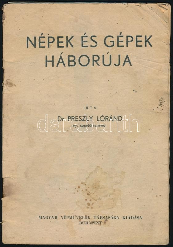 Preszly Lóránd, Dr. ny. csendőrezredes: Népek és gépek háborúja. Bp. [é.n.] Magyar Népművelők Társasága. 59p.. Számos szövegközti fényképpel illusztrálva.Borító nélkül