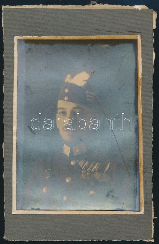 Beschreibung: cca 1920 Katona sok kitüntetéssel, albumlapra ragasztott fotó, 9×6,5 cm