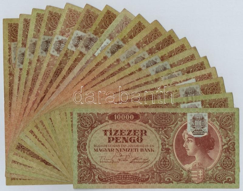 1945. 10.000P (18x) "MNB" bélyeggel T:III https://www.darabanth.com/de/339-Fernauktion/339.0/Numismatik/Ungarische-Banknoten~1500011/1945-10000P-18x-MNB-belyeggel-TIII~II1909070