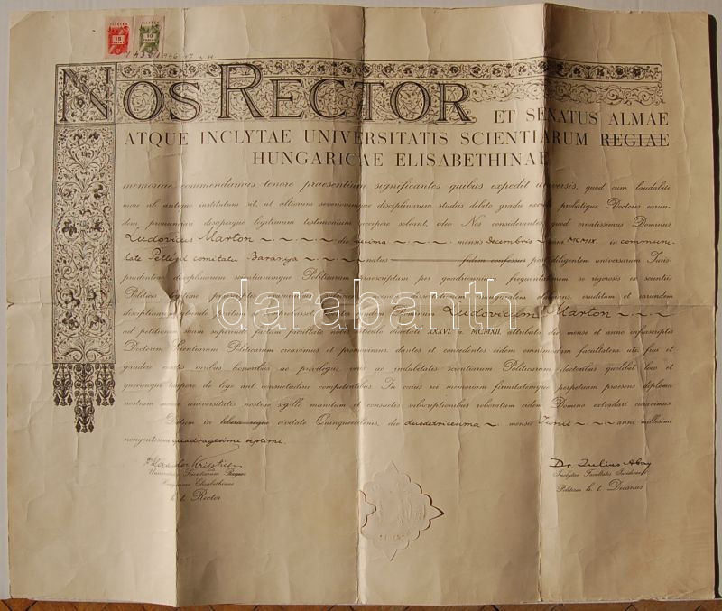 1946 Politikatudományi diploma 25 Ft illetékbélyeggel https://www.darabanth.com/de/34-Fernauktion/34.0/Andere-Sammelgebiete/~107/1946-Politikatudomanyi-diploma-25-Ft-illetekbelyeggel~II68162