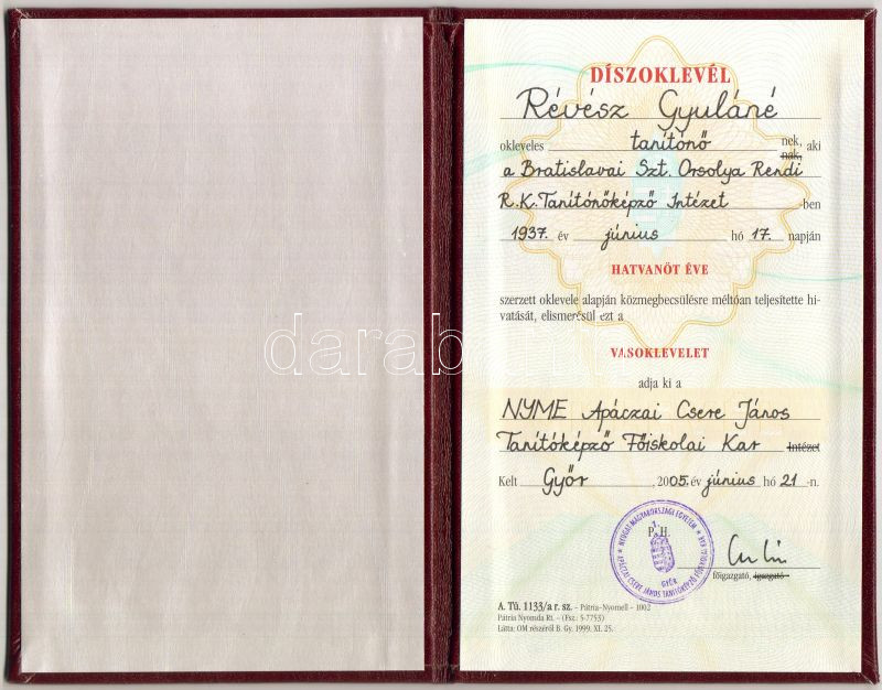Beschreibung: 2005 Győr, Vasoklevél 65 éve végzett pedagógus részére
