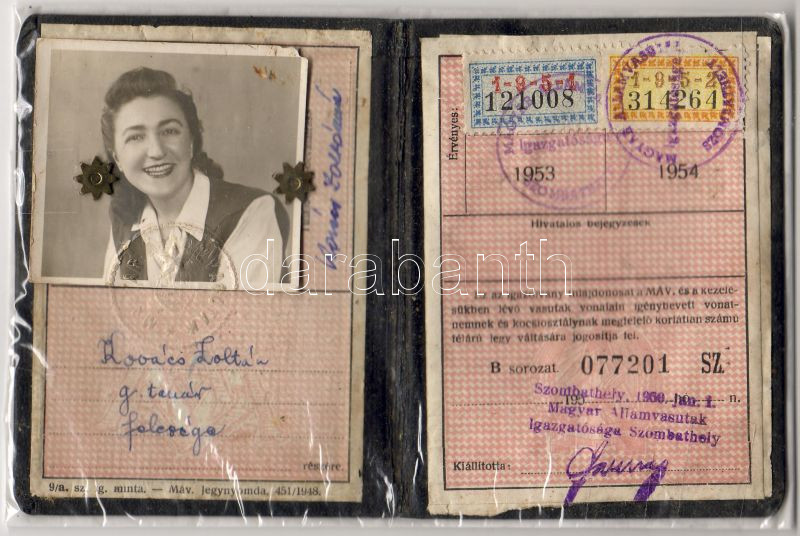 MÁV arcképes igazolvány 1951-1954 bélyegekkel https://www.darabanth.com/de/34-Fernauktion/34.0/Andere-Sammelgebiete/~107/MAV-arckepes-igazolvany-1951-1954-belyegekkel~II58617