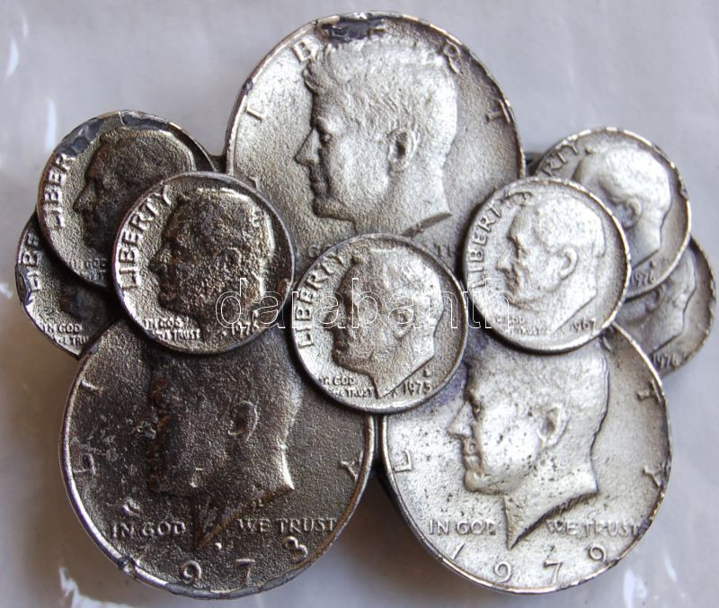 Beschreibung: USA övcsat pénzérmékből 10c (7x), 1/2$ Kennedy (3x)