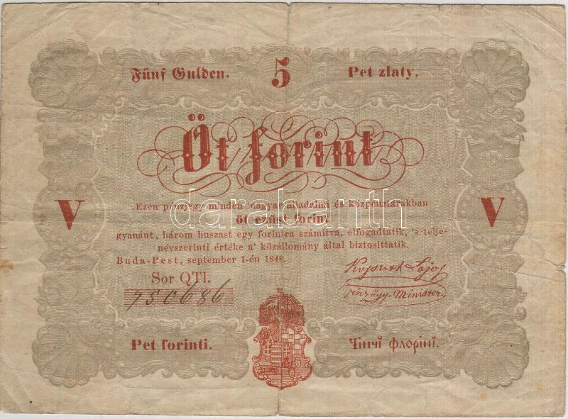1848. 5Ft "Kossuth-bankó" T:III https://www.darabanth.com/de/34-Fernauktion/34.0/Numismatik/~126/1848-5Ft-Kossuth-banko-TIII~II68368