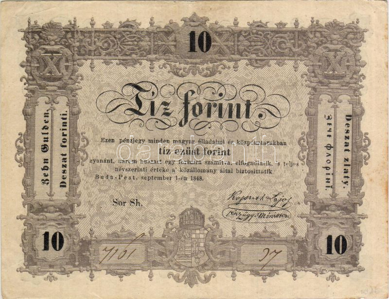 Beschreibung: 1849. 10Ft feketén nyomott szöveg és számok erősen jobbra tolódva! T:II Csak hajtva, den nem törve!