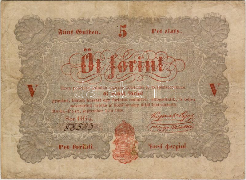 1849. 5Ft "Kossuth-bankó" címer erősen jobbra tolódva! T:II https://www.darabanth.com/de/34-Fernauktion/34.0/Numismatik/~126/1849-5Ft-Kossuth-banko-cimer-erosen-jobbra-tolodva-TII~II68419