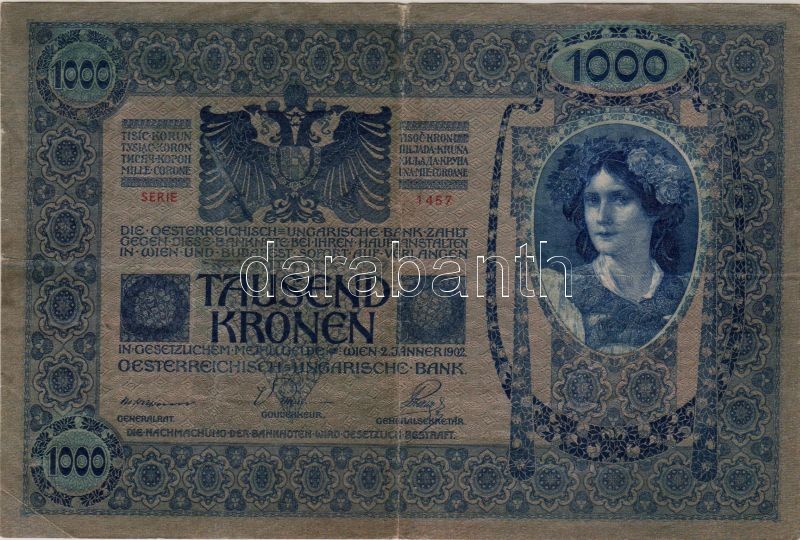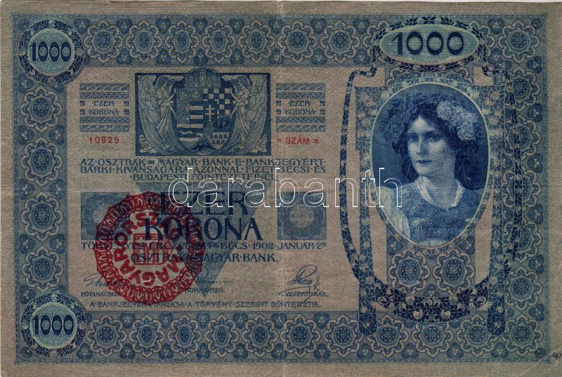 1902. 1000K piros "Magyarország" fny-sal T:III+ https://www.darabanth.com/de/34-Fernauktion/34.0/Numismatik/~126/1902-1000K-piros-Magyarorszag-fny-sal-TIIIplus~II63735