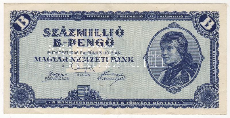 Beschreibung: 1946. 100.000.000B.-pengő "MINTA" lyukasztással T:I-