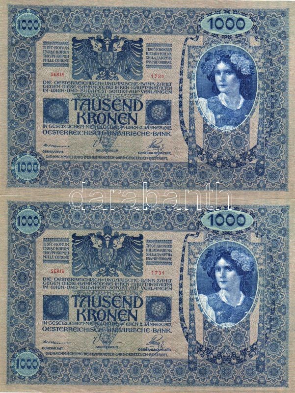 Beschreibung: Ausztria 1902. 1000K (2x) egymásutáni sorszámokkal "Deutschösterreich" fny-sal T:I