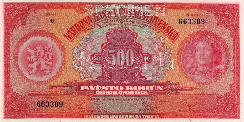 Beschreibung: Csehszlovákia 1929. 500K "SPECIMEN" lyukasztással T:I