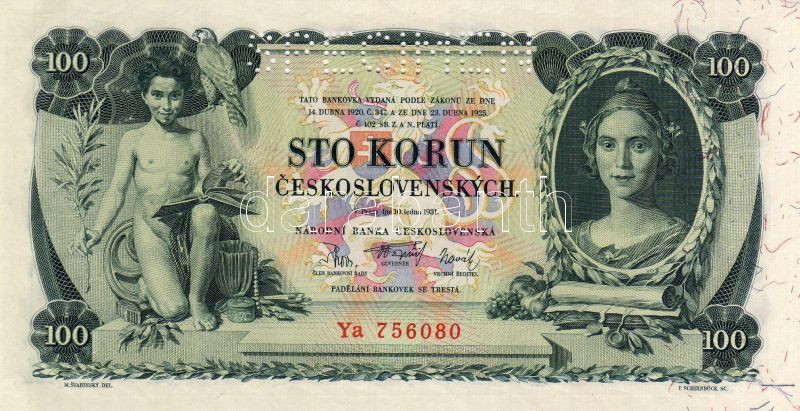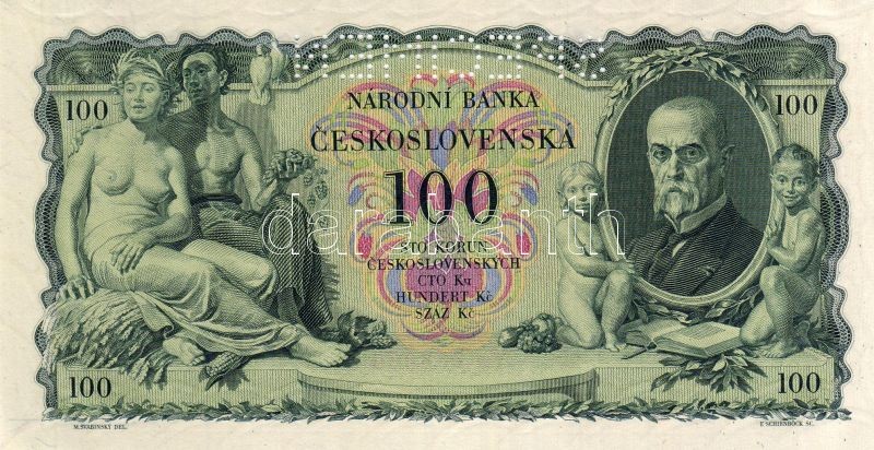 Csehszlovákia 1931. 100K "SPECIMEN" lyukasztással T:I https://www.darabanth.com/de/34-Fernauktion/34.0/Numismatik/~126/Csehszlovakia-1931-100K-SPECIMEN-lyukasztassal-TI~II68353