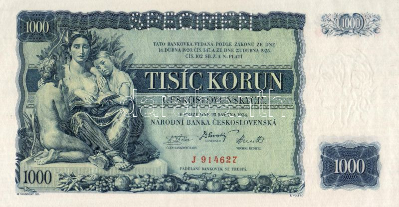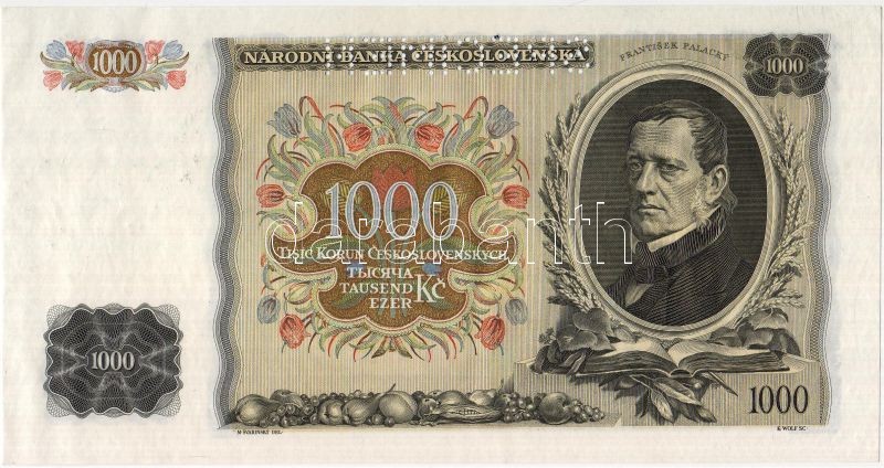 Csehszlovákia 1934. 1000K "SPECIMEN" lyukasztással T:I https://www.darabanth.com/de/34-Fernauktion/34.0/Numismatik/~126/Csehszlovakia-1934-1000K-SPECIMEN-lyukasztassal-TI~II68350