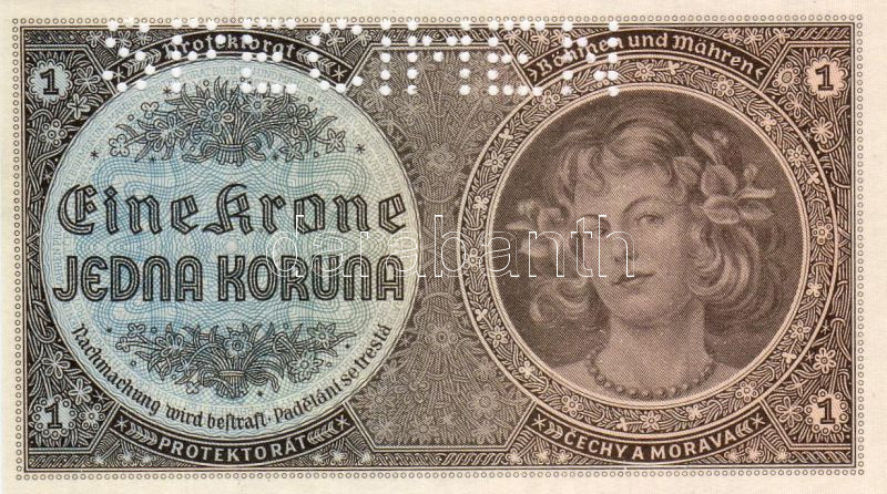 D.Reich/Cseh-Morva Protektorátus 1940. 1K "SPECIMEN" lyukasztással T:I https://www.darabanth.com/de/34-Fernauktion/34.0/Numismatik/~126/DReichCseh-Morva-Protektoratus-1940-1K-SPECIMEN-lyukasztassal-TI~II68361