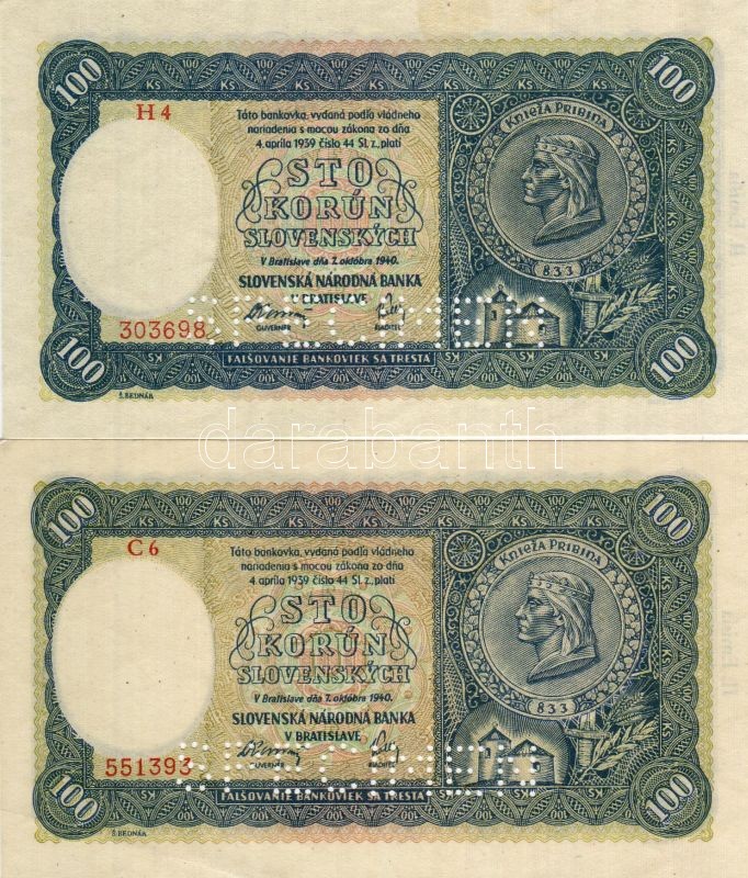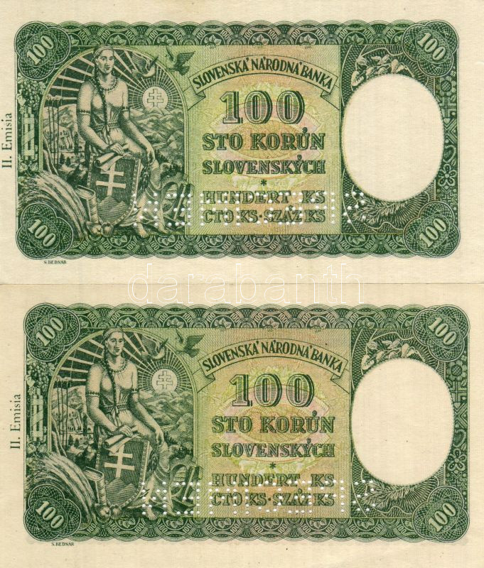 Szlovákia 1940. 100K (2x) "SPECIMEN" lyukasztással T:I https://www.darabanth.com/de/34-Fernauktion/34.0/Numismatik/~126/Szlovakia-1940-100K-2x-SPECIMEN-lyukasztassal-TI~II68356